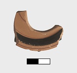 | Description: | Single fragment of foot and lower wall preserving ca. 15% of the original circumference of the foot. Tinged gray from burning at breaks. Underside of floor with carefully chipped and smoothed edges suggesting that the missing piece was used as a sherd disk. Slightly flaring ring foot with flat resting surface. Wall flares out conically. Black glaze on exterior and interior. Reserved: underside of floor, with two added purple lines; resting surface of foot, also with added purple line; and sharp edge of foot. Thin purple band at base of wall. Attic clay. | |