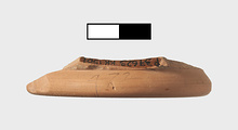 | Description: | Single fragment preserving nearly half of the foot. Rounded ring foot with trace of lower wall. Lightly mottled black glaze on interior and on underside of floor. Reserved: foot, a band 2 mm wide at interior edge of underside, and lower wall. Fine light orange Attic clay. | |