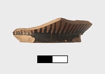 | Description: | Single fragment preserving about one-quarter of the original circumference of the foot and lower wall. Flaring ring foot, interior face slightly convex but straight below junction with underside of floor. Black glaze on interior and exterior of foot. Reserved: underside of floor with thin circular band of glaze; sharp edge of foot. On lower wall: zone of dense triangular rays. Attic clay. | |