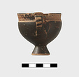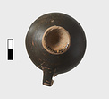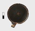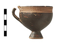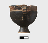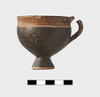 | Description: | Complete body, except for few chips at rim. Small fragment mended on interior lip (by the handle), a point of impact suggests it was produced during excavation. Upper part of handle missing, preserved part mended. Glaze preserved in very good condition but for some light abrasion on one side. Two tiny pin holes under decorated band. Small cup. Tall conical foot; lower body rising to vertical upper wall; rim, offset from body by scraped groove, flares gently to rounded lip. Vertical handle attached from body below midpoint directly to rim, rising slightly above the level of the lip. Reserved rim decorated with tight zigzag pattern in diluted orange paint, framed by thin band above and below. Handle barred. Reserved: underside of foot and a band at exterior of foot; band at interior of lip, and circle at center of cup floor with two black dots off center. Orange-buff clay. | |
