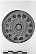 Description:   The top has no knob, but a heavy overhanging rim, and is unevenly flat. Straight, very thin sides. In black: on top, in concentric bands from center out: a circle, row of dots, circle, dots, large irregular blobs; the upper side of the rim. On walls, a row of crude water birds, to right, with dots or short bars above and below, between them; a narrow band around the bottom.