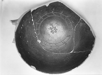 | Description: | Both handles, most of one side of rim and wall missing. Medium deep bowl; wide low foot carefully profiled. Below handles, near foot, a careful rib and groove. Reserved, a line at top of foot; the bottom of the footring; central panel of underside of foot, except two small circles and a dot in center. Inside, in center, a small well stamped rosette surrounded at a fair distance by a ring of laurel leaves. Black glaze inside and out. Attic clay; good glaze and fabric. | |