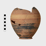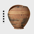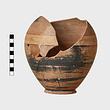 Description:   The lower part and portions of the should of an oinochoe(?). The body glazed black with a reserved band decorated with a dilute zigzag bordered by lines, running around it under the handle. Similar to P 3939. Low flaring base.