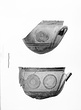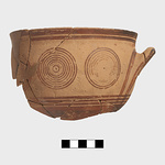| Description: | Part of the upper portion of a large kylix, glazed inside and outside below, with pendent lines from the horizontal handle. Above, three compass-drawn circles with a zigzag below the lines around the rim. | |