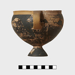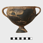 Description:   Pieces missing. Vertical ribbon handles, one missing, decorated with bars. Glazed over all, inside and out, including conical foot. Reserved line around rim.