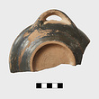 | Description: | Half of an open bowl, with a ring base and horizontal handle. Slightly out-turned rim. Glazed black inside and out, except for reserved lines around the rim. | |