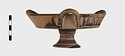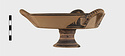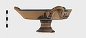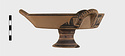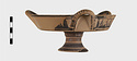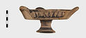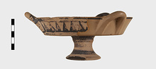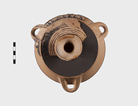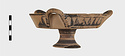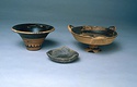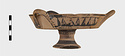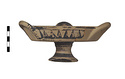 | Description: | Half a flat dish with deep upturned rim and high horizontal handle.Restored in plaster. High splaying foot. Outside, on the rim, tooth pattern; beneath and on the foot glazed bands of varying width; inside, a cross with dots at the edge of the circle between the arms, and glazed bands of varying width. Solid glaze inside the rim. | |