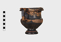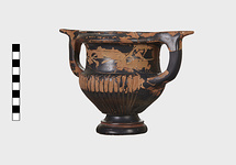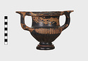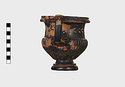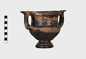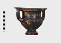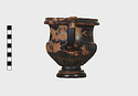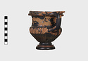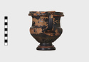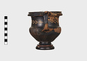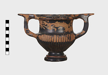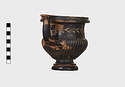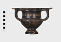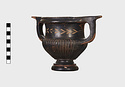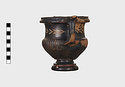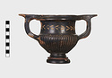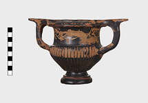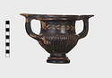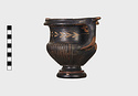 | Description: | Part of one handle and small chips from the side are missing: restored in plaster. Heavy foot with no stem; reeded bowl; thickened lip; handles flat on top ending in spurs. Around the neck a wreath of bay(?), in thinned clay. The foot was covered with red ochre before being glazed; now exposed by scratching in a line around the middle of the foot and one on its underside. The glaze has flaked somewhat. | |