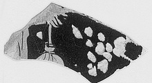 | Description: | From the side of a small open pot glazed inside. Skyphos? Outside, at left, part of a draped figure and end of fingers of its left hand, holding a sponge bag or aryballos by a string. Youth going to gymnasium. Pinkish gray clay. Relief contour; excellent glaze, chipped. | |