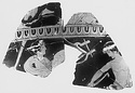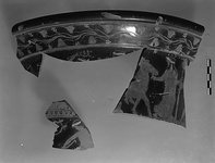| Description: | a) Near the top of the fragment is an ovolo band; below is a nude male figure facing to the left, his hair bound by a white band. He holds some indistinguishable object in his outstretched right hand. Above his head to the left are the arms and cross bar of a lyre. b) Wall fragment depicting both upper and lower zones divided by a band of egg and dot. Of the upper zone are the feet of two draped figures hurrying right; of the lower zone the head and shoulder of a garlanded youth, right, with a scarf billowing out behind his shoulders. At the left, the hand of a figure, right, holding a filleted torch. White for the line of rocky ground in the upper zone, for the boy's fillet and for a streamer on the torch. Attic clay; black glaze inside. Belongs with P 5107. | |