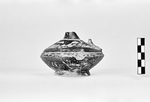 | Description: | Neck, ring handle, and a bit of one side missing. Low solid foot, slightly concave. On top in clay-colored paint, a wreath with white dots; above it, also in clay-colored paint, two pairs of very crudely drawn dolphins. Buff-brown clay, slightly micaceous. Thin metallic glaze, brown in spots outside and under foot. | |