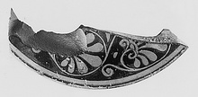 | Description: | Only a small piece of the lid is preserved, with parts of two very neat palmettes. A narrow band outside the palmettes, the inside of the lid, and the bottom of the flange are reserved. Fine clay, burned almost gray. Black glaze good. | |