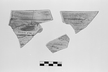 | Description: | Nearly half the circumference of the rim, and one handle, preserved; none of the base. Held together with plaster. Horizontal glazed bands on the rim. On the handle zone vertical stripes and zigzags. Inside, glazed all over, fired dark red. All much worn. Soft buff clay. | |