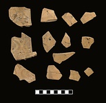 | Description: | Fourteen fragments from large stand with cuttings in sides. a) mended. Decorated with half circles and triangles. b) mended. Decorated with incipient palmette pattern, curled over. Three fragments with rays; five fragments from upper part with palmettes pendent between volutes with triangles above. The kalyx shape seems most probable. Clay light pinkish buff. The black glaze almost entirely worn away. Inside unglazed. Early Orientalizing style, early 7th c. B.C.(?) For palmette motif, cf. P 894; CVA Cambridge, 1, pl. II:7; AM 22 (1897), p. 279, fig. 12. | |