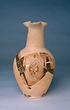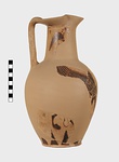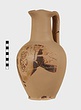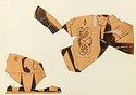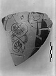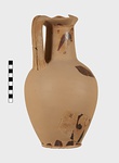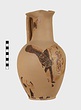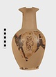 | Description: | Very fragmentary but only the lip entirely missing. Restored in plaster. Double-round handle, lip to shoulder. Low ring foot. Above the foot, broad rays. On the body, two sphinxes facing each other. The faces are drawn in outline. The wing feathers of the sphinx to the left are incised; of the sphinx to the right rendered in outline. The hair falls in a heavy mass down each side of the neck, which is reserved, and decorated in both cases by a necklace rendered by a triple horizontal line. Between the sphinxes is a large palmette cross, large palmettes above and below, filling the inside of an 8-shaped figure; horizontal palmettes at the crossing. Above, triangle and lozenge star. Panel decoration on the neck; part of a large lotus is preserved; filling ornaments, zigzags and diamonds. Narrow, vertical stripes on the handles. Fine pinkish buff clay with buff surface. Glaze dull brownish black. Ζ 1660: Joining fragment of left hand sphinx, giving front part of body, with part of neck, lower necklace, and spring of her wing feathers. Also a fragment of floral ornament (from the back?). | |