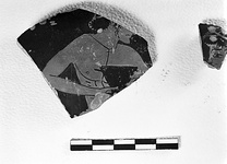 Description:   Head of a youth, left, wearing a wreath of flowers in added white. Relief contour. (Perhaps from the same pot as P 4674?)
