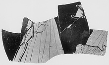 | Description: | From a bell krater. Part of two women, draped, moving right. The one at left wears a Doric chiton and holds an oinochoe in her right hand. The one at right wears a thin chiton and himation. Wine pours from a kantharos in her right hand. Added color for the fluid. Contours for the upper part of the kantharos. Brown wash on the jug. | |