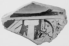| Description: | From a late bell krater. Part of olive wreath on lip, below, head of draped woman, wearing a long-tailed cap, left, facing a column. On the other side of the column, part of a wing. Glaze fired mostly red. No contours. | |