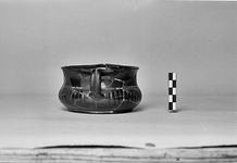 | Description: | Two-handled mug. One handle, much of floor and wall missing; restored in plaster. Low base ring; shallow reeding; plain beading at root of neck; double handles. Firm black glaze scratched away from grooves inside and outside base ring. | |