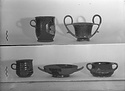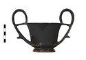| Description: | One handle, part of the other and much of the wall missing. Restored in plaster. High base ring; upper wall sharply setoff from lower. Band handles, spurred. Reserved bands around bottom of base ring and on underside. Glaze somewhat flaked and blotchy. For the shape cf. Athens N.M. 1236 (the handles slightly lower). A. Two Amazons; B. Amazons and Greek - two good examples in Polyandrion of the Thespians; same shape exactly. | |