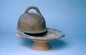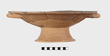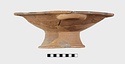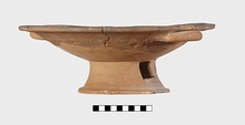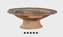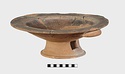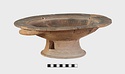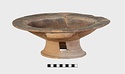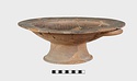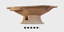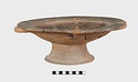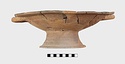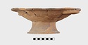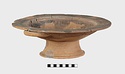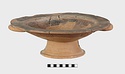 | Description: | Handles and many fragments missing; restored in plaster. High stand with two rectangular openings in side. Broad flat rim with two loop handles beneath it. Gritty brown clay fired dark in middle, rubbed on surface. Cf. Agora XII, no. 2038. | |