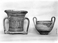 | Description: | Flat-bottomed kantharos with low base, convex body, and plain straight lip; two vertical strap handles lip to shoulder looped high over lip. One handle broken off but repaired. Wide black band above base; narrow band; on shoulder, series of double half ellipses, the inner ones cross-hatched, separated by four vertical lines between each. On lip between narrow bands, cross-hatched triangles. Interior glazed save for reserved dot at center of floor. On handles, three halved St. Andrew's crosses, each divided from the next by four narrow horizontal bands. Slipped; dull black glaze badly peeled. | |