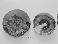 Description:   More than half preserved. High ring foot. Rosettes around the rim outlined in dark blue or black and set in a brighter blue background. The centers of the flowers below the rim are green, the petals a dark blue, In the central portion the leaves are green, the flowers blue. The exterior was plain white with small scattered ornaments; preserved are two: a circle in blue and an uncertain object in blue(?) and green. The paint in the petals is, in places, so thick that it gives the effect of relief.