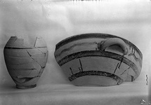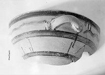 Description:   Two fragments, a large one preserving about a third of the circumference of the rim and one horizontal loop handle; and a small one, a bit only from the wall. None of the base remains. Profiled wall; plain lip tilted inwards. The inside unglazed, except the lip. Outside, three broad bands of glaze, and a wavy band in the handle zone.