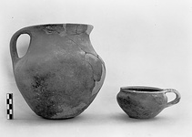 | Description: | Flat-bottomed cup with rather bulging, rounded, side wall and short plain lip, one vertical strap handle, lip to below shoulder. Entirely glazed except for reserved band outside lip, another inside lip, dot at center of floor, and resting surface. Handle covered with parallel strokes. Buff slip; thick, rather metallic black to reddish glaze. Late Geometric. | |
