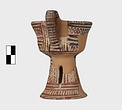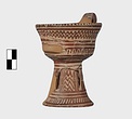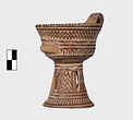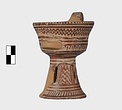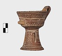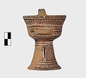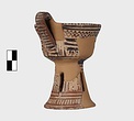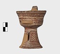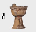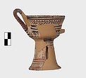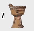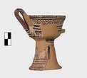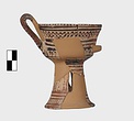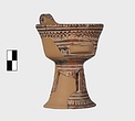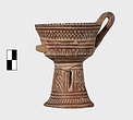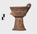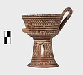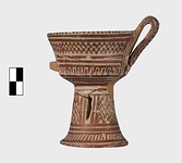 | Description: | A cup similar to P 4986 (Β 1330), the full height of the base preserved. Inside, bands around top; solid glaze below; on the lip, dots; outside, zigzags between bands on both cup and stand. Around the bottom of the cup, a band of interlocking vertical strokes; around the bottom of the stand, a band of slanting strokes. The attachments for a small horizontal handle preserved opposite the vertical one, low down on the body of the cup. Buff clay; dull red glaze. | |