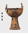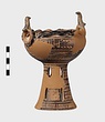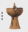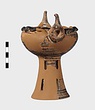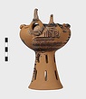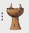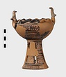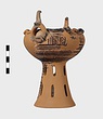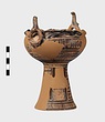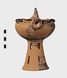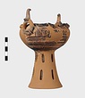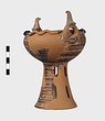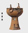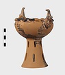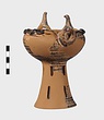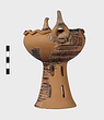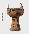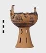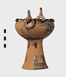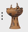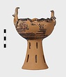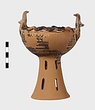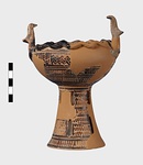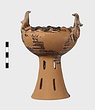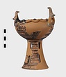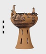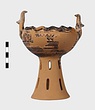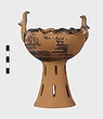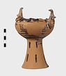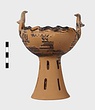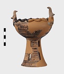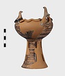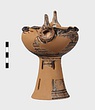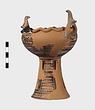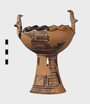 | Description: | Mended from many pieces; about a half of the cup and the start of the stand preserved. A large rim fragment, a bit of a snake, and a second bird do not join. Fragment b) is a non-joing fragment of the stand. Restored in plaster with additional fragments of the foot. Shallow bowl on perforated stand; one vertical ring handle preserved, with bird perched on top looking into cup. Around outside of lip, a plastic snake. Inside glazed black; series of strokes on lip. Outside, horizontal and vertical zigzags separated by bands. Buff clay; dull black glaze. | |