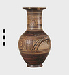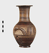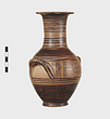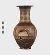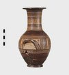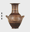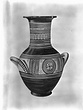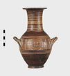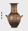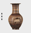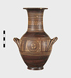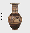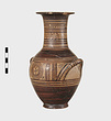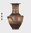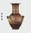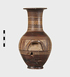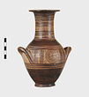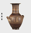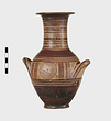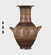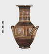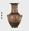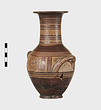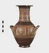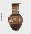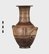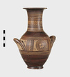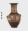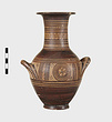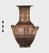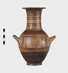 | Description: | Mended from several pieces; one small chip missing. In shape a Dipylon amphora in miniature. Ring foot, ovoid body, straight neck and flat flaring lip; two upward tilted horizontal loop handles. Glazed solid to handle band and on shoulder. Handle band, bordered above and below by three narrow bands, has on each side, a panel bordered by diagonal strokes between vertical narrow bands. In each panel, a Maltese cross, hatched, surrounded by four concentric circles. In the corners of the panels and above the handles at their points of attachment, dot rosettes. On neck: two bands, row of dots, three bands, three horizontal parallel zigzags, three bands, row of dots, three bands. Upper surface of lip glazed. On handles, parallel strokes between bands. Slipped, thick streaky glaze, black to brownish. | |