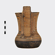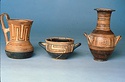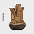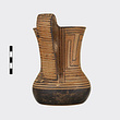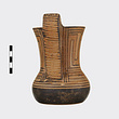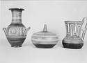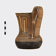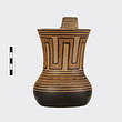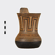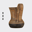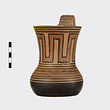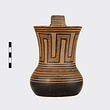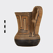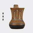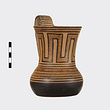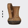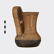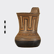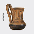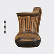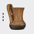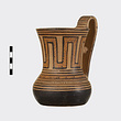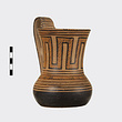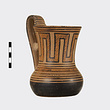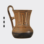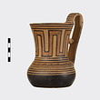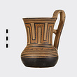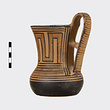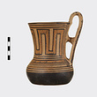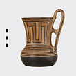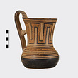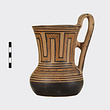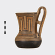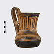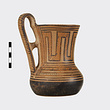 | Description: | Intact. Squat rounded body and high slightly concave neck. One high vertical strap handle, from plain lip to shoulder, with strut. Glazed solid to point of greatest circumference, then three narrow bands. At point of handle attachment, row of dots, band, zigzag between bands. On neck, hatched plain maeander. Outside lip, three narrow bands; on its upper face, five series of parallel strokes. The handle has plain horizontal narrow bands except at the top where it curves over; there, an eight-armed cross. Buff slip; thick black glaze, thinned to brownish for hatching. | |