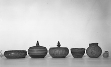 | Description: | The lip mended; a few fragments missing. Squat round-bodied jug with slightly flattened bottom. Low neck and wide outward-flaring lip. No handle. Tie-holes in the lip. Fine soft rather micaceous buff clay, which was very porous and pliable when damp in the grave and came off in soft splinters where broken. Perhaps under-baked? Handmade. The surface is mottled by a black substance; probably not glaze, but a black unlike any glaze, which has adhered to the surface of the clay. | |