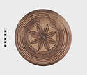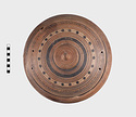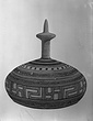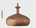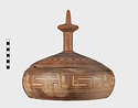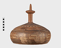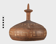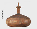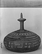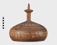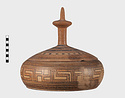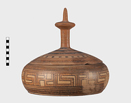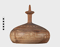| Description: | The lid mended from several pieces; complete except for chips. The body complete, but cracked. a) Pyxis: Low ring foot; convex body; lip flanged inside to receive lid; flange and lid pierced for tying. Two bands around bottom; zigzag; three bands; wide zone; panels separated each by a vertical band; in the panels alternating hatched maeander sections running left and hatched swastikas. Two bands; horizontal zigzags; two bands. On bottom: at center, eight-leaved flower, with herringbone veins in the leaves; around it a wide zone of cross-hatching between narrow bands, two inside, three outside. b) Lid: Rather high convex lid, with very high spiked knob handle. Around edge, wide zigzag zone between three narrow bands inside and out. Linked dots, three narrow bands, wide band, two narrow bands, wide band, two narrow bands, wide band at base of handle. Entire handle covered with narrow bands except outer face of knob, which has zigzag. Buff slip; black glaze, somewhat peeled. | |