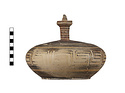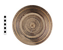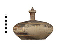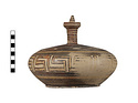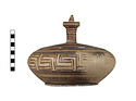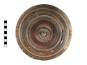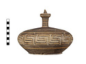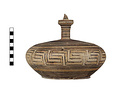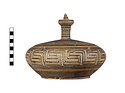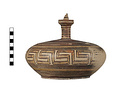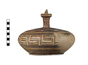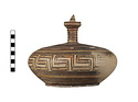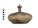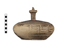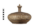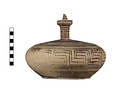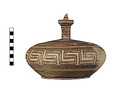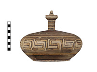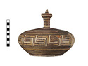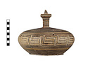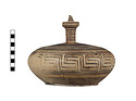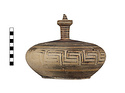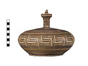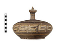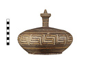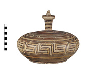 | Description: | The lid mended from three pieces; the body from many. a) Pyxis: Low ring foot. Convex side wall, the point of greatest circumference higher than the middle. Flanged; pierced for tying. Wide band around bottom; horizontal zigzag band with three narrow bands above and below; in wide zone, hatched maeander running left; horizontal zigzag between three bands above and below. Glazed red inside; at center of floor, in reserved circle, eight-armed cross surrounded by three reserved bands; wide reserved band, dotted; four reserved bands. Bottom: center, eight-armed cross surrounded by four bands, row of dots, four more bands. b) Lid: Shallow convex lid with spiked knob handle (tip missing); around edge: three bands, row of dots, three bands, wide band, two bands, wide band at base of handle. Handle covered with bands except upper and outer faces of the knob which are dotted. Fine creamy slip; dull black to red glaze, much peeled. | |