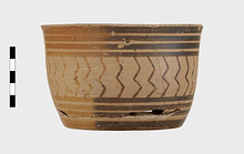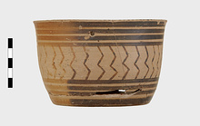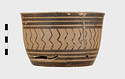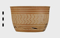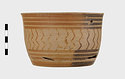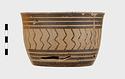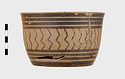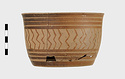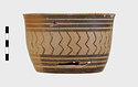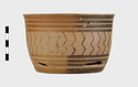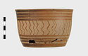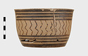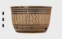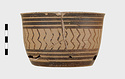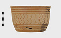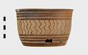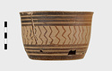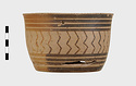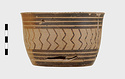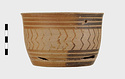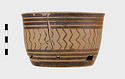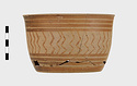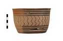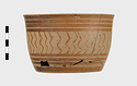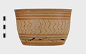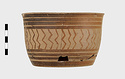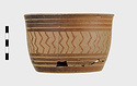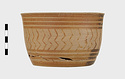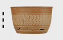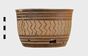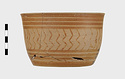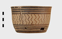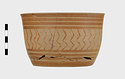 | Description: | Mended from several pieces; a few chips missing. Flat-bottomed bowl with nearly straight slightly convex side wall, very slightly flaring to a plain lip. A single tie hole near the edge. Resting surface reserved. Around bottom, four bands. Wide zone: reserved, with vertical zigzags, widely separated. Four bands around lip. Upper surface of lip dotted. Interior glazed solid except for two reserved bands around inside of lip. Buff slip dull black to red glaze, somewhat peeled. | |