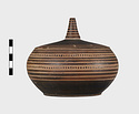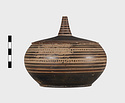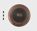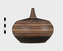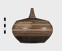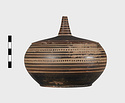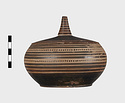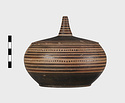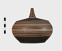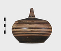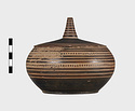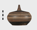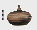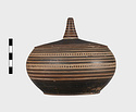 | Description: | Lid and body intact. a) Pyxis: Low base; convex body; point of greatest circumference higher than the middle: flanged inner lip, flange and lid pierced for tying. Wide band around bottom, three narrow bands, row of dots, three narrow bands, row of dots, three narrow bands. Wide band on flange. Bottom undecorated. b) Lid: slightly convex with spike handle. Glazed black except for three reserved bands at outer edge. Narrow bands on handle. Creamy slip; dull black glaze. | |