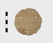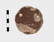 | Description: | Circular disc, cut from the side wall of a very large open pot with bands outside; solid glaze inside. Slightly convex on outer side. Three small round holes are pierced through it near the edge, forming a triangle. Outside, heavy creamy slip, glaze peeled. Inside, thick reddish brown glaze. To be used as a lid? | |