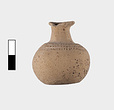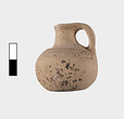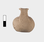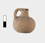 | Description: | Round-bodied, flat-bottomed handmade pot with narrow neck, flaring lip and one vertical strap handle lip to shoulder. On shoulder at handle attachment zone, incised, two horizontal lines, dotted on each side. Micaceous pale buff clay, unglazed. | |