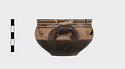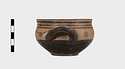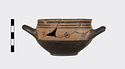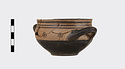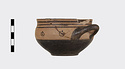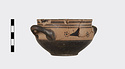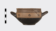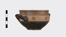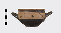 | Description: | Mended from several pieces; a few chips missing from rim and sides. Flat-bottomed cup with convex body and short straight lip; two horizontal loop handles, tilted slightly upward. Lower body and outer face of handles glazed solid; in handle zone, each side, three dot rosettes; on lip, three bands. Inside glazed solid except for reserved band around lip and reserved dot at center of floor. Buff slip; thick, rather dull black glaze. | |