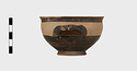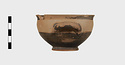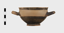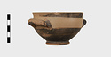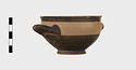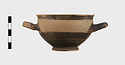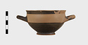 | Description: | Intact; one chip missing from lip. High flaring pseudo-ring foot; otherwise as P 5070 (Β 1354) and P 5071 (Β 1355), but with body somewhat deeper, lip somewhat narrower. Entirely glazed except resting surface (inside foot) under handles, handle band, upper edge of lip; dot at center of floor. Creamy slip; thick rather dull black glaze, somewhat peeled. | |