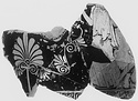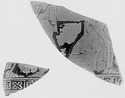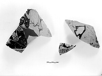 | Description: | Six joining and one non-joining wall fragments. a) A female figure hurries left, her right arm raised; palmettes below handle. A bit of the drapery of another figure at the right. b) Feet of two figures facing; on one the edge of a garment shows; he carries a staff. On the other, no drapery appears. Below a band of maeander punctuated by saltire squares. Relief contours. Flaky black glaze. The clay a light buff. Same pot as P 134. Two other fragments, joining to right and to left of a) found October 1955 in Box 100 (= Stoa filling?). | |