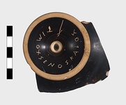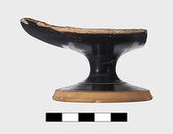 | Description: | From a cup similar in shape and fabric to P 5116 (A 1038). Graffito neatly incised on underside of foot. Cf. Agora XII, no. 436. ADDENDA P 5116: Low stem, offset lip. Handle space, inside of handles and outer edge of foot reserved. Glaze scratched away from a line on top of foot. | |