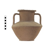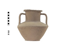 | Description: | Squat unglazed amphora with sharply profiled body, wide neck and flat ring base. Projecting rim slightly concave on top. Horizontal ridges around neck, and very shallow irregular vertical ridges around lower part of body. Coarse pinkish-buff clay with large bits; cream slip. | |