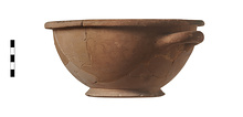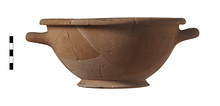 | Description: | One handle and much of the wall missing; restored in plaster. Similar in shape and fabric to P 5156 (Α 1078). On side wall some senseless scratching. On underside of floor, the ligature <graphic> is repeated three times in overlapping confusion. Cf. P 5116 (Α 1038) for the same graffito. ADDENDA P 5156: Sharply profiled base ring; downturned lip. | |