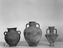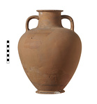 | Description: | Fragments missing from wall; restored in plaster. Piriform body; low flaring base ring; flat lip; broad handles. Thin brown glaze outside and on inside of body; heavier glaze on lip and inside neck; also for two narrow bands below lower handle attachment. | |