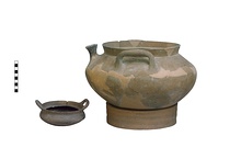 | Description: | One handle and much of the wall missing; restored in plaster. Flat bowl rounded below; ledge for lid surrounded by high rim, from top of which rise the vertical handles. Gritty brown clay, blackened by fire. On base, graffito: <graphic> | |