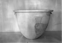 | Description: | Much missing from wall; restored in plaster. Flat bottom. Massive rim flat on top. On either side a large lug beneath lip. Coarse yellow clay. Cf. Beazley (1946), Potter and Painter, p. 17, n. 2. | |