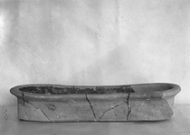 | Description: | Most of the floor and much of the wall missing; restored in plaster. Flat bottom; straight sides; rounded ends. Rim flat on top and projecting outside. Covered with brown glaze on inside only. Cf. Agora XII, no. 1846. | |